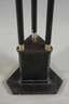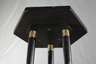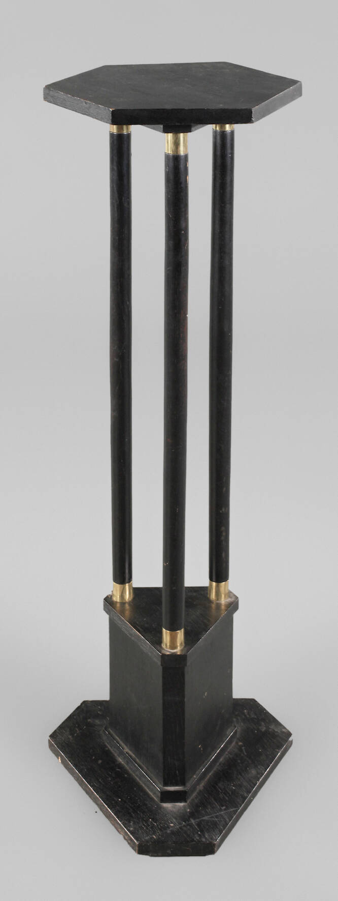 Eiche massiv, schwarz gebeizt, um 1910, drei schlanke Rundsäulen auf Messingbasen und Kapitelle auf dreieckigem Sockel montiert, sechseckige Platte, Altersspuren Maße 105 x 27 x 27 cm.