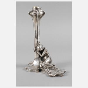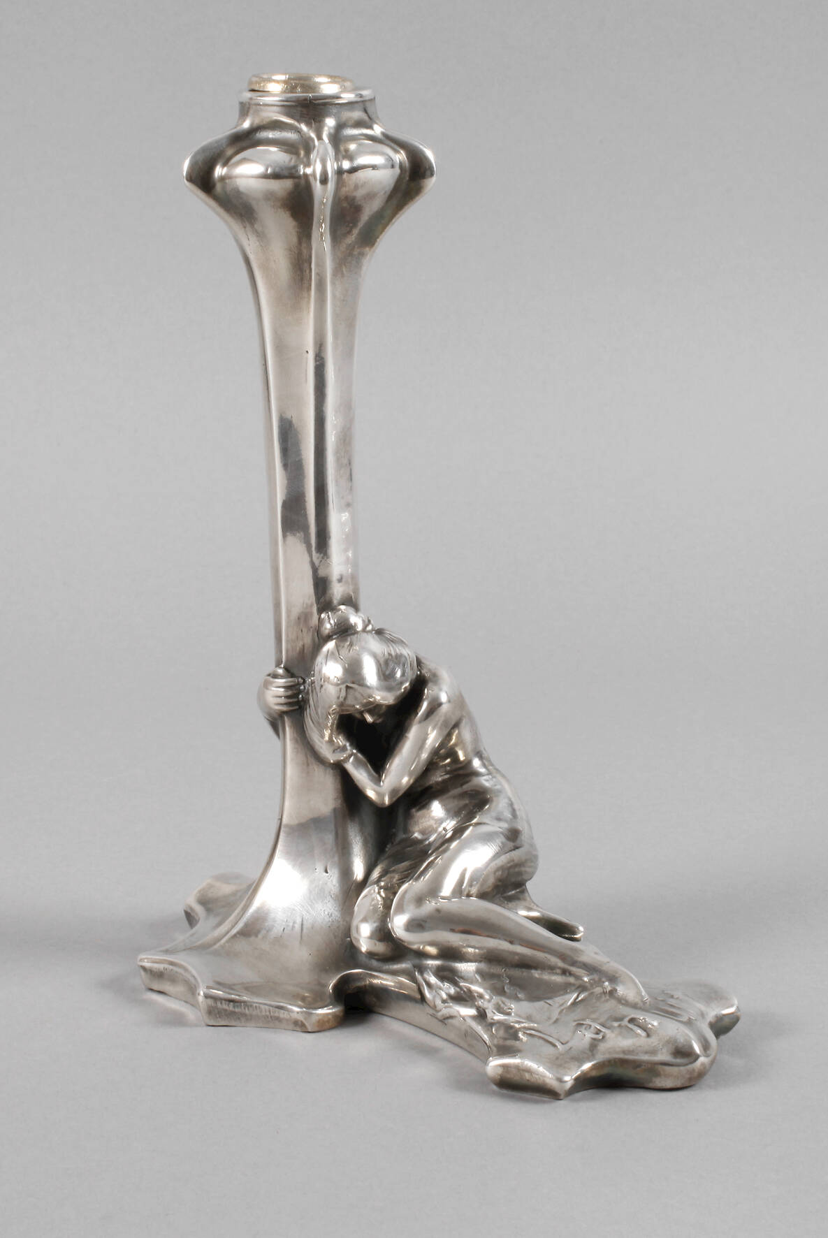 um 1900, Metallguss versilbert, Modellnummer 4079, hohl gearbeitet, am Fuß eine sitzende Frauenfigur, Schaft mit knospenartiger Verdickung, ergänzter Einsatz, WMF I/O, normale Altersspuren, H 26 cm.