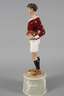 signiert und datiert 1913, ungemarkt, altes Klebeetikett mit Nr. 1142 und einem Preis von 100.-, Malermonogramm JB, die Modellnr. auch geritzt, Steingut farbig bemalt und farblos glasiert, auf einem Podest mit reliefierten Fußballern und Siegesgöttin stehender stolzer Fußballer, eine Girlande mit Blüten, Lorbeerlaub und Eichenlaub in der Hand haltend, etwas Alterscraquelé, am Mützenschirm ein kleiner Kratzer, sonst guter altersgemäßer Zustand, H 53 cm.
