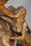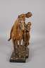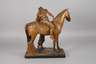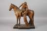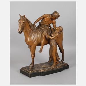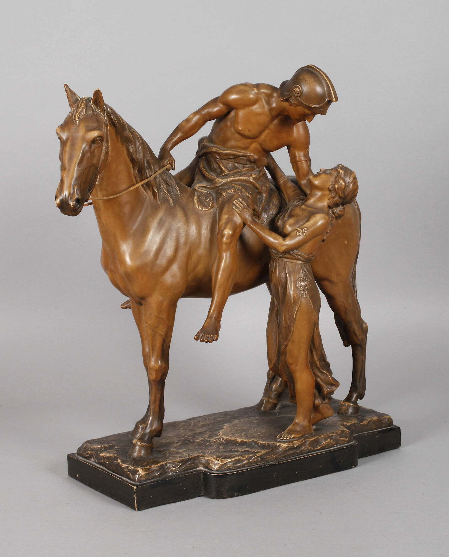 um 1900, Prägemarke R & T Modbo gesetzlich geschützt, Modellnummer 2393, Majolika matt in dunklen Tönen bemalt, Opernszene aus Richard Wagners Oper ”Die Nibelungen”, Darstellung der Verliebten Siegfried und Brünhild beim Abschied, Brünhild überlässt ihm ihr Ross ”Grane” und sendet ihn ”zu neuen Taten teurer Helde”, nachdem sie sich ewige Liebe und Treue geschworen haben, Kopf des Pferdes geklebt, mit kleinen Fehlstellen, L 55 cm.
