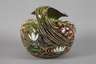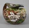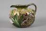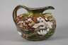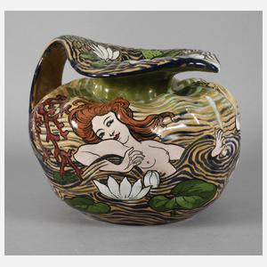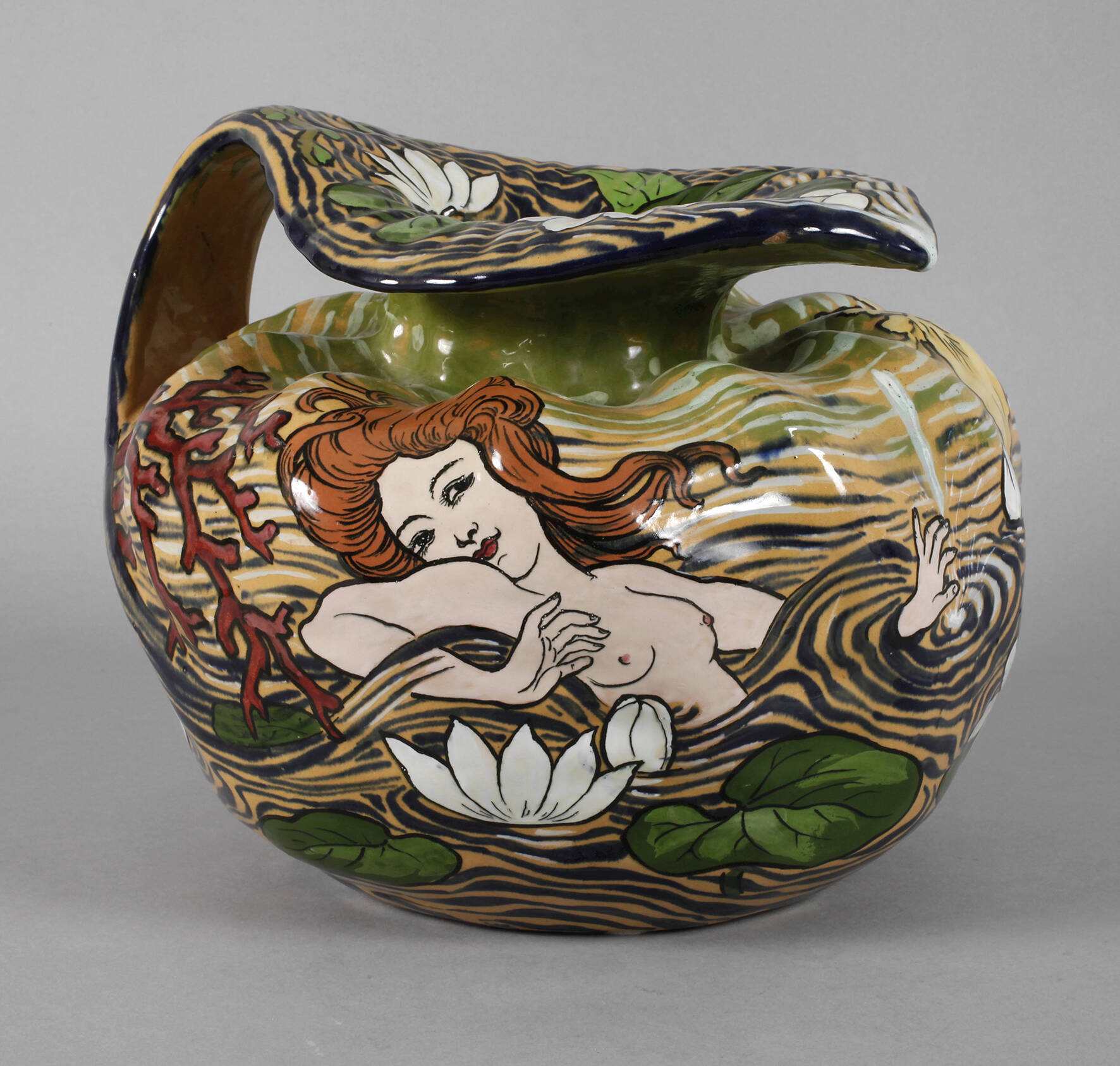 Entwurf für das Kaufhaus "Au Bon Marché - Paris" um 1900, ungemarkt, hellbrauner Fayencescherben mit gebuckelter Schulter und breitem Griff, welcher in die Tülle ausläuft, farbenfrohe Bemalung, junge Frau mit wallendem Haar in einem Seerosenteich badend, seitlich Irisblüten und äugende Fische, ein kleiner unbedeutender Chip unterhalb des Mündungsrands, sonst guter Zustand, H 27 cm, D 30 cm. Quelle: Internet.
