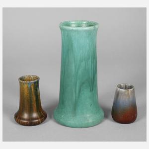 um 1910, eine Vase gestempelt mit Modellnr. 1337, cremefarbenes Feinsteinzeug handabgedreht, verschiedenfarbige Laufglasur, eine am Rand mit kleiner Glasurfehlstelle, H max. 18 cm.