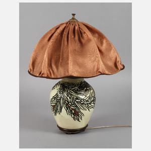 Tonwerke Kandern, um 1900, ziegelroter Scherben hellgrün glasiert, in dicker Schlickermalerei, Kiefernzweige, um 1920 zur Lampe umgebaut, gedrechselter Holzfuß mit angeschraubten, schwarz lackierten Messingfüßen, zweiflammig elektrifiziert, dazu ein Seidenschirm der Zeit, Elektrik restaurierungsbedürftig, Alters- und Gebrauchsspuren, H total 51 cm.