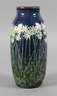 Ende 19. Jh., Ritzmarke LM, Hersteller wohl Tonwerke Kandern, ziegelroter Scherben, die Wandung mit Drehrillen, kobaltblaue Glasur, umlaufend Schlickermalerei mit stilisierten Margeritenblüten, am Hals stärkeres Alterscraquelé, H 28 cm.