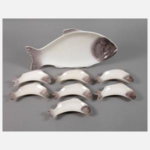 Entwurf Adolf Müller 1901, Stempelmarke, Modellnummer 3468, Schriftzug Made in Germany, Steingut in Violetttönen bemalt und farblos glasiert, bestehend aus einer übergroßen Fischvorlegeplatte und sieben Nierenschälchen, guter altersgemäßer Zustand, L Platte 53 cm.