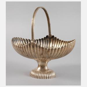 um 1910, gestempelt Halbmond, Krone, 800, Herstellermarke Wilkens & Söhne Hemelingen, Vertriebsstempel Herm. Jürgens, Modellnummer 185525, graviertes Besitzermonogramm "LR", gerippte Ovalform, innen vergoldet, klappbarer Henkel, geringe Altersspuren, L 25 cm, G ca. 506 g.