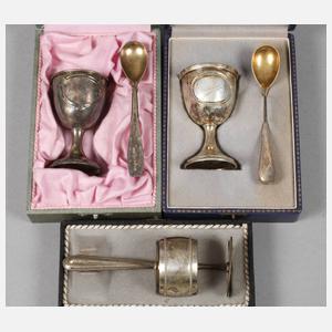um 1900, zwei Becher jeweils mit Löffeln, einer versilbert, einer gestempelt Halbmond, Krone, 800, Herstellermarke Lutz & Weiss Pforzheim, Gravur "Werner", dazu ein Breischieber mit Serviettenring, alles im originalen Etui, teilvergoldet, G total ca. 81 g.