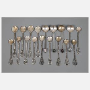 1. Hälfte 20. Jh., 18 Stück, mit gedreht gerippten Griffen, vier mit Abschlüssen aus Halbedelsteinen, die Laffen aus gewölbten Münzen Brasiliens und dem Iran, L max. 12 cm, G total ca. 142 g.