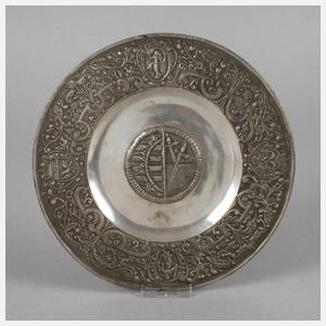 Nachguss nach historischem Vorbild Leipzig oder Dresden, unleserliche Punzen, mittig Sachsenwappen, umlaufend florale Ornamentik mit Figuren, Vogelmotiv und Doppeladler, Altersspuren, D 21,5 cm.