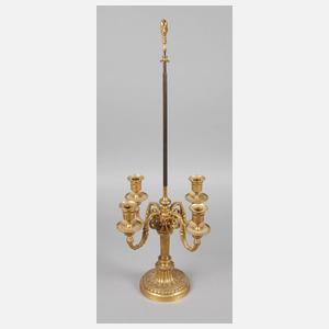 Entwurf vermutlich Jean Charles Delafosse (1734–1789), letztes Drittel 18. Jh., Bronze fein gegossen und feuervergoldet, Rundfuß verziert von Ornamentbändern, kannelierte Säule mit Lorbeerkranz als Schaft, feststehende, eingerollte Leuchterarme, ebenfalls kanneliert, mit Palmettenbesatz, schraubbare Tüllen, später für Elektrik vorbereitet, Eisenstab im 19. Jh. ergänzt, Schirm fehlt, H 73 cm.