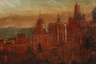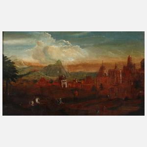 Phantasielandschaft, vor einer Stadt mit Türmen und Palästen ankommende Pilger sowie Reiter mit Pferden und Dromedaren, wohl imaginäre Ansicht des biblischen Jerusalem, minimal pastose Malerei, Öl auf Holz, barock, Malerei partiell stärker verputzt, gerahmt, Falzmaße ca. 27 x 43,5 cm.