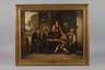 Männer beim Würfeln am Tisch im Kneipeninterieur, lasierende Genremalerei, Öl auf Leinwand, um 1900, rechts unten signiert "J. Arlet", Craquelure, gering restauriert, mit Messingrahmenschild "J. Arlet" gerahmt (Rahmung partiell mit Kratzern), Falzmaße ca. 55 x 68,5 cm.