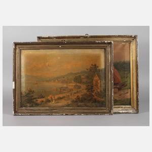 Rahmen um 1870, aus ca. 5 cm breiter, unterschiedlich steigend profilierter versilberter und auf Goldton schellackpatinierter Holzleisten, Rahmenrücken original ockerfarben gefasst, Gehrungen geschnitten, Erhaltungsmängel, original beigefügt "Kinder unterm Sonnenschirm" bzw. "Sommerliche Flusslandschaft" als Chromolitho, Falzmaße ca. 45 x 60 cm und 42 x 59 cm.
