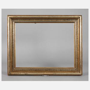 um 1870, Rahmen aus ca. 5 cm breiter, zur Rahmenmitte steigend profilierter, feingliedrig mit Perlstäben, Eierstäben und Mäanderband gestuckter, ähnlich einer Berliner Leiste versilberter und schelllackpatinierter, partiell vergoldeter und schwarz grundierter Holzleiste, Gehrungen geschnitten, Erhaltungsmängel, Falzmaße ca. 51,5 x 32,5 cm.