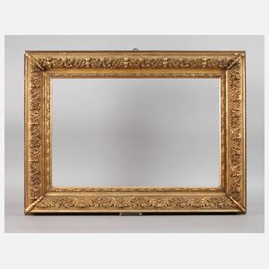 um 1870, Rahmen aus ca. 11 cm breiter, steigend profilierter, rückseitig gekehlter, mit ornamentalen Stuckfriesen verzierter vergoldeter Holzleiste, Gehrungen über Eck gearbeitet, bestoßen, Falzmaße ca. 49 x 73 cm.