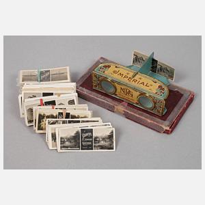 um 1900, gemarkt Imperial NPG, französisch bezeichnet, klappbares Gestell aus Weißblech, mehrfarbig lithografiert und vergoldet, dazu ca. 200 passende Stereoskopbilder unterschiedlicher Werbeträger, u.a. Stollwerck, Bella Vista Cigaretten, Chaussures Bally etc., im Pappetui, leichte Alters- und Gebrauchsspuren, L 10,5 cm.