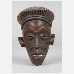 Westafrika, 20. Jh., Tropenholz beschnitzt, rot und braun gefasst, mit geschnitzten bzw. aufsitzenden Tatauierungen verziert, weit abstehende Ohren und gerillte Kopfbedeckung, sehr gute Erhaltung, H 18,5 cm.
