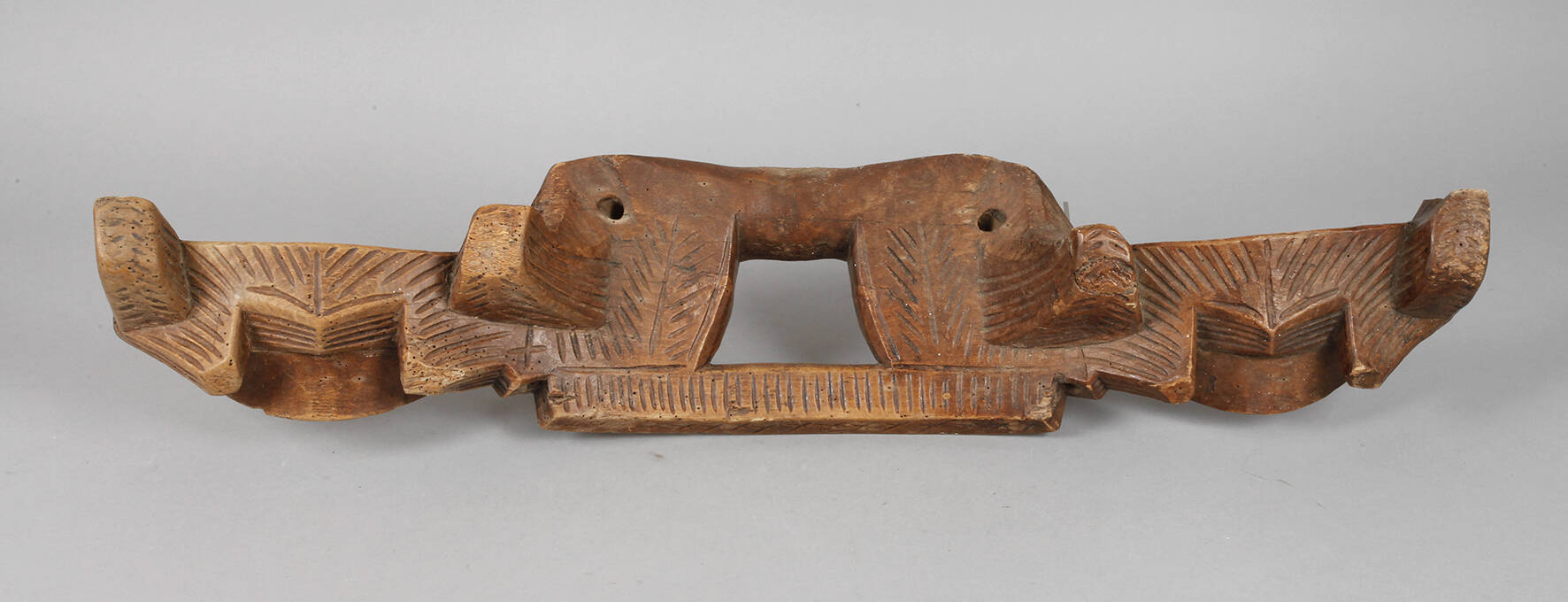 20. Jh., Holz geschnitzt, bräunlich gefasst, geschwungene Lehne bzw. Kopfstück eines Häuptlingssitzes, L 95 cm