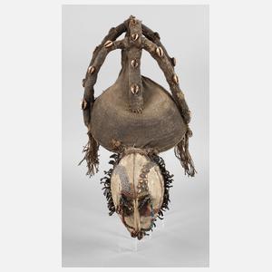 westliches Afrika, Aufsatz aus geflochtenem Bast, besetzt mit Kaurischnecken, darunter kleine, weiß gefasste Holzmaske mit schmaler Nase, verziert von farbigen Perlen, kleinen Muscheln und Kaurischnecken, H ges. ca. 60 cm.