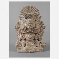 ohne Alters- bzw. Echtheitsbestimmung, möglicherweise präkolumbische Priesterterrakotte, hellgraubraune Keramik, Reste von Farbfassungen, Erdanhaftungen, hohl gearbeitet, kaum beschädigt, H ca. 22,5 cm.