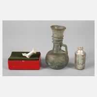 undatiert, römisch/byzantinisch/osmanisch, kleines kugelbauchiges Einhenkelfläschchen mit hohem Hals, dieser mit umgelegter Stabverzierung (H ca. 11,4 cm), kleine hexagonale Flasche (H ca. 6 cm), Hals und Mündung eines kleinen bauchigen Fläschchens (H erhalten ca. 3,5 cm), altersgemäße Erhaltung.