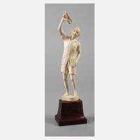 wohl Erbach, um 1910, Elfenbein aufwendig beschnitzt, vollplastisch gearbeiteter junger Knabe mit einem Bündel Zeitungen, auf Palisandersockel montiert, etwas gegilbt, H 26,5 cm.