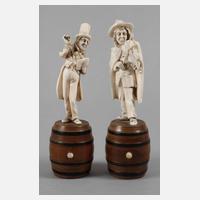 wohl Erbach, Ende 19. Jh., Elfenbein aufwendig beschnitzt, vollplastische Darstellungen eines Violinisten sowie eines Dirigenten, jeweils auf gedrechseltem Holzsockel in Fassform montiert, Altersspuren, H 15,5 und 16 cm.