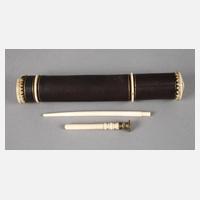 19. Jh., zylindrischer, lederummantelter Korpus mit Zierelementen aus Bein, graviertes Initial S mit Krone, mit kleiner Petschaft und Federhalter, Substanzverluste, Altersspuren, L 17 cm.
