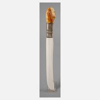 1920er Jahre, Griffstück aus Silber, gestempelt 835, der Abschluss aus beschnitztem Bernstein mit Frauenportrait im Profil, die Klinge aus Elfenbein, trocknungsrissig, Altersspuren, L 33 cm.