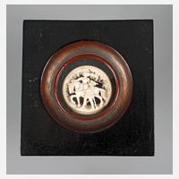 19. Jh., überaus fein beschnitztes Medaillon, durchbrochen gearbeitet, mit Darstellung einer mittelalterlichen Szenerie mit Reiterin und Galant, vor angedeuteter Landschaft, hinter Glas in geschwärztem Rahmen gefasst, Maße 11 x 12 cm.