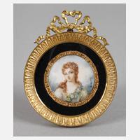 Anfang 20. Jh., undeutlich signiert Dauty?, Gouache auf Elfenbein, Bruststück einer jungen Frau, im blütengeschmückten Gewand, vor Himmelszelt, hinter Glas in zartem Messingrahmen im Empirestil gefasst, D innen 4,5 cm. BITTE BEACHTEN: VERSAND ERFOLGT NUR INNERHALB DER EU - SHIPPING TO EU MEMBER COUNTRIES ONLY.