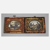 Anfang 20. Jh., eine bezeichnet n. Kawitzky, Gouache auf Elfenbein mit partieller Weißhöhung, mit spitzem Pinsel festgehaltene genrehafte Szenen einer Schabatfeier bzw. einer Schachpartie, hinter Glas in messingverziertem Rahmen in Boullétechnik, Altersspuren, Maße je 11,5 x 14 cm.