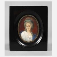 Anfang 20. Jh., undeutlich signiert, Gouache auf Elfenbein, im Empirestil gearbeitetes Portrait einer jungen Schönheit im wallenden Gewand, vor monochromem Fond, in geschwärzter Holzleiste gefasst, Altersspuren, Maße 15 x 12 cm.