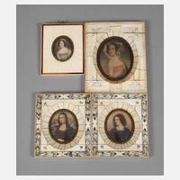 Anfang 20. Jh., teils bezeichnet, Gouache auf Elfenbein mit partieller Weißhöhung, miniaturhafte Reproduktionen klassischer Vorbilder, alle hinter Glas in gravierten Elfenbeinrahmen gefasst, unterschiedliche Maße und Erhaltungen, Maße max. 12 x 15 cm.