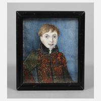 1. Viertel 19. Jh., unsigniert, rückseitig teils undeutlich bezeichnet Mein Großvater Ernst Binder geb. 6. April 1798?..., Gouache auf Papier, Bruststück eines jungen Mannes im hochgeschlossenen Gehrock vor monochromen Fond, in geschwärzter Leiste hinter Glas gefasst, Altersspuren, Maße 9 x 7,5 cm.