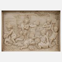 signiert und datiert 1875, fein ausgearbeitetes Marmorrelief mit musizierenden und spielenden Putten bzw. Faunen, in einem stark reliefierten Goldstuckrahmen, rückseitig mit altem Zeitungspapier beklebt, Rahmen etwas restaurierungsbedürftig, Gesamtmaß 22 x 28 x 6 cm.