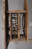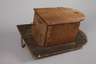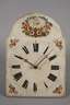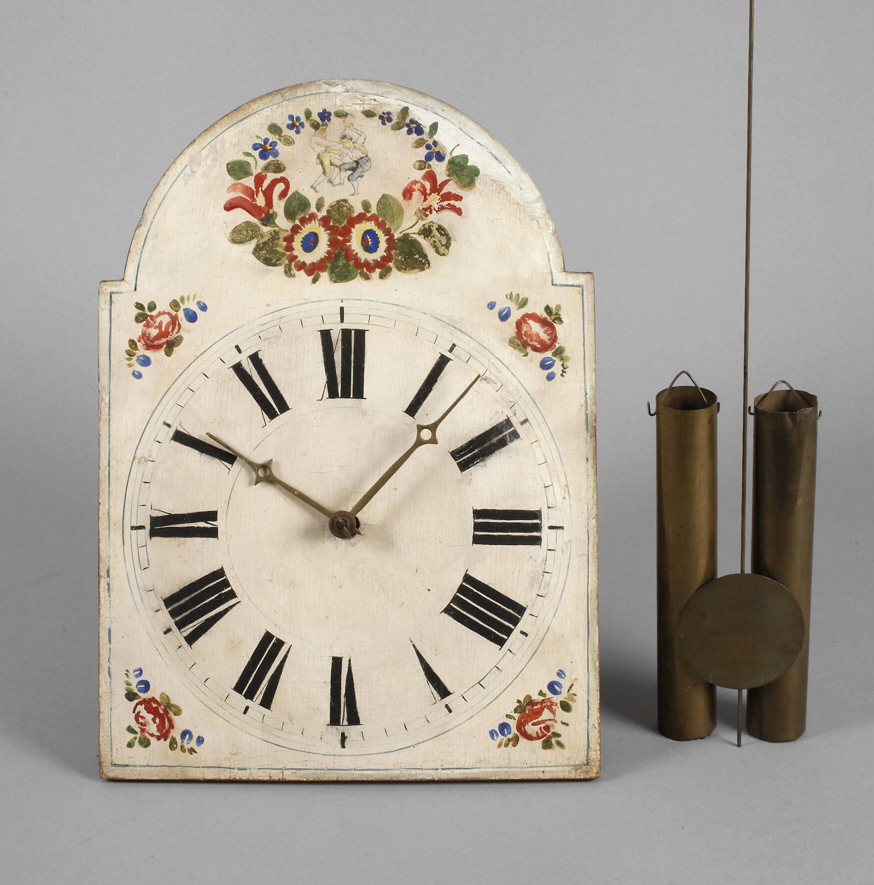 um 1900, Holzplatinenwerk mit Stundenschlag auf Tonspirale, funktionstüchtig, Teile des Gehäuses ergänzt, Schild im oberen Bereich ausgebessert, H Schild 35 cm.