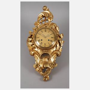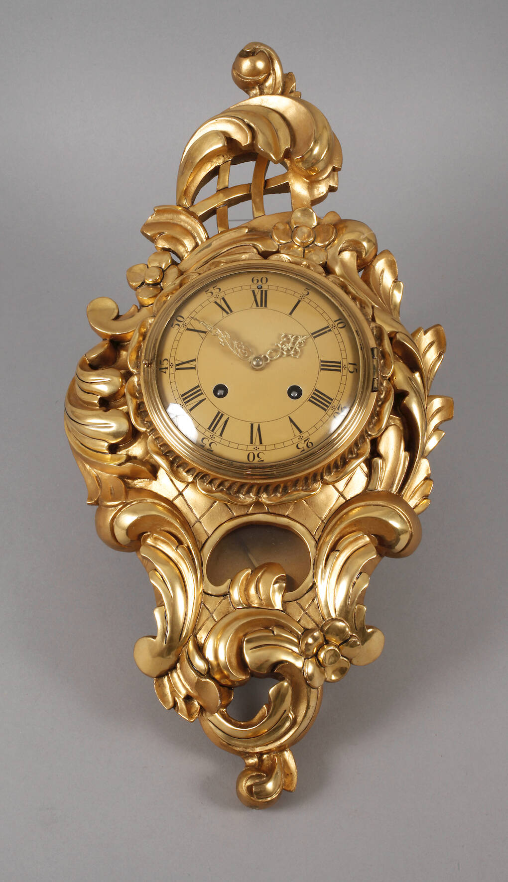 Mitte 20. Jh., gemarkt Westerstrand Töreboda, Pendulenwerk mit Halbstundenschlag auf Glocke, handgeschnitzter Korpus in Form einer Rocaille, Gehwerk läuft, Schlagwerk nicht, ohne Schlüssel, H 57 cm.