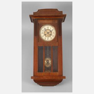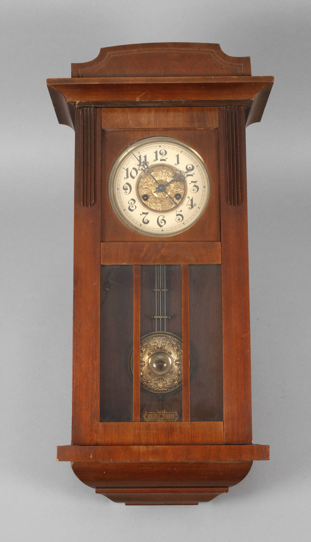 um 1905, gemarkt Friedrich Mauthe Schwenningen, im Nussbaumgehäuse, Ziffernblatt mit Blüten verziert, Halbstundenschlag auf Tonfeder, funktionstüchtig, mit Schlüssel, normale Altersspuren, H 77 cm.