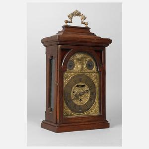 um 1780, auf Ziffernblatt signiert, Gehäuse aus massivem Nussbaum, Front aus vergoldeter Bronze mit fein ziselierten floralen Motiven, von einer Amphora bekrönt, 3 Aufzüge und Ausschnitt für Scheinpendel, Hakenhemmung, Viertelstundenschlag und Repetition auf zwei Tonfedern, Werk überholungsbedürftig, mit Schlüssel, H 50 cm x B 27cm x T 16 cm.