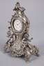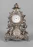 deutsch, um 1890, gestempelt 800, Halbmond, Krone, Hersteller Martin Meyer Mainz, im Rokokostil gearbeitetes Gehäuse mit zwei musizierenden Putten, feines Emailziffernblatt mit römischen Zahlen und arabischer Minuterie, partiell vergoldet, Werk mit Zylinderhemmung, nicht funktionstüchtig, mit Schlüssel, H 12 cm.
