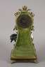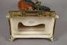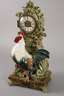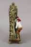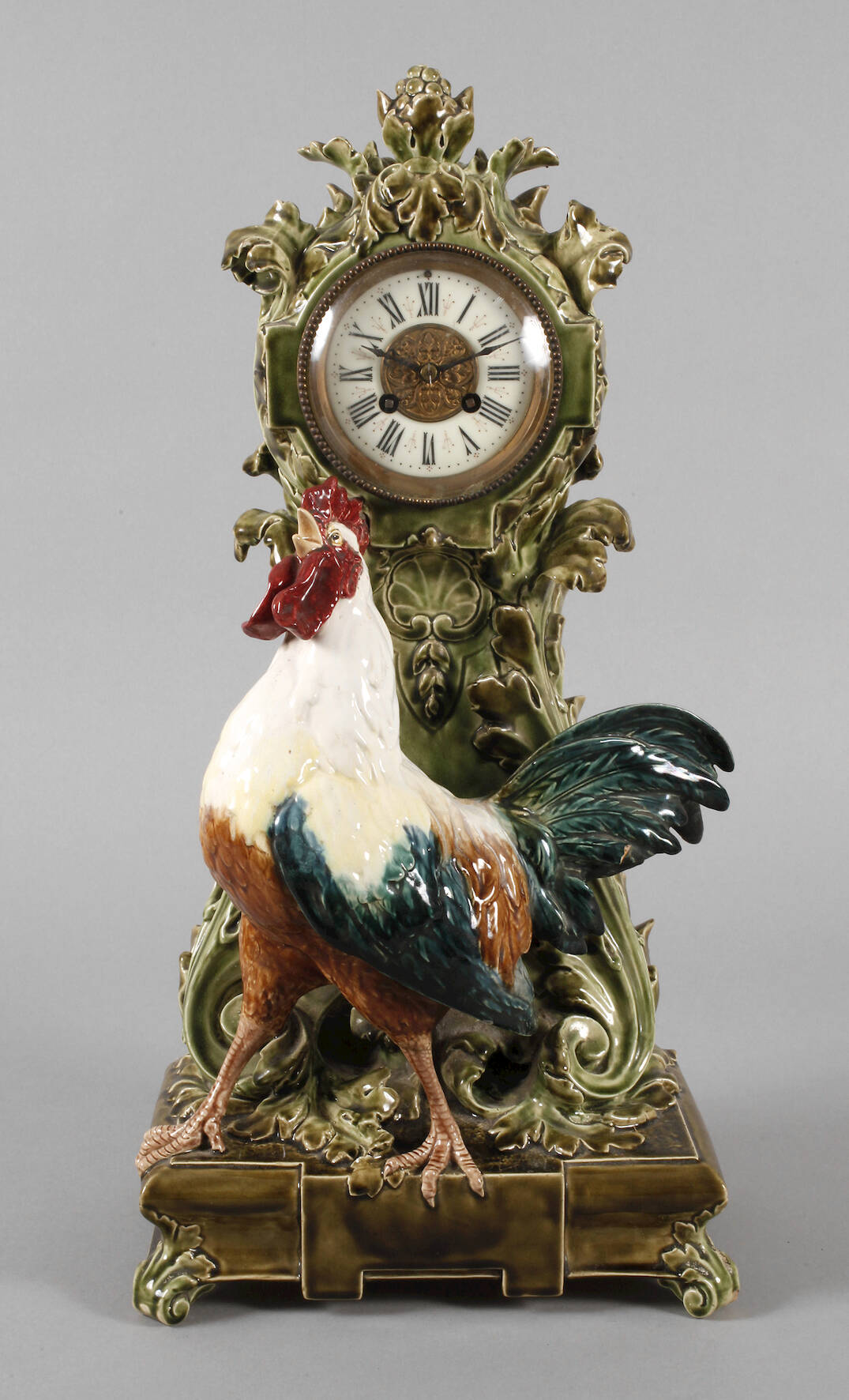 Frankreich, um 1900, unleserlich gemarkt Houtin & Boulenger Choisy, heller Steingutscherben mehrfarbig glasiert, Pendulenwerk mit Halbstundenschlag auf Glocke, makelloses Emailziffernblatt mit römischen Zahlen, Pendel und Schlüssel fehlen, eine Schwanzfeder fehlt, Werk reparaturbedürftig, H 58 cm.