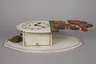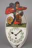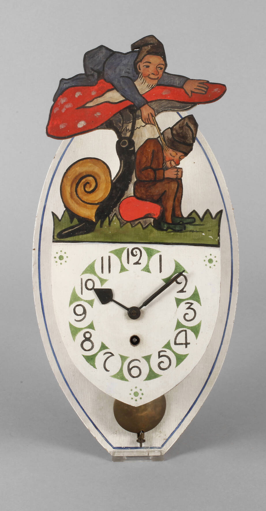 Entwurf um 1908 für ein Kinderzimmer, Ausführung Oskar Schönfeld München, Schichtholz mit handgemaltem Zwergendekor, Pendulenwerk ohne Schlag, Pendelfeder eingerissen, sonst guter Zustand und funktionstüchtig, mit Schlüssel, H 41 cm.