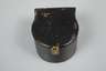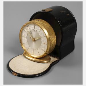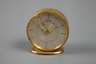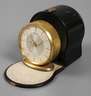 Schweiz, 1950er Jahre, kleiner Wecker mit 8-Tagewerk, aus vergoldetem Messing, im originalen Lederetui (Schließe defekt), funktionstüchtig, H 4,7 cm.