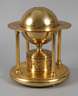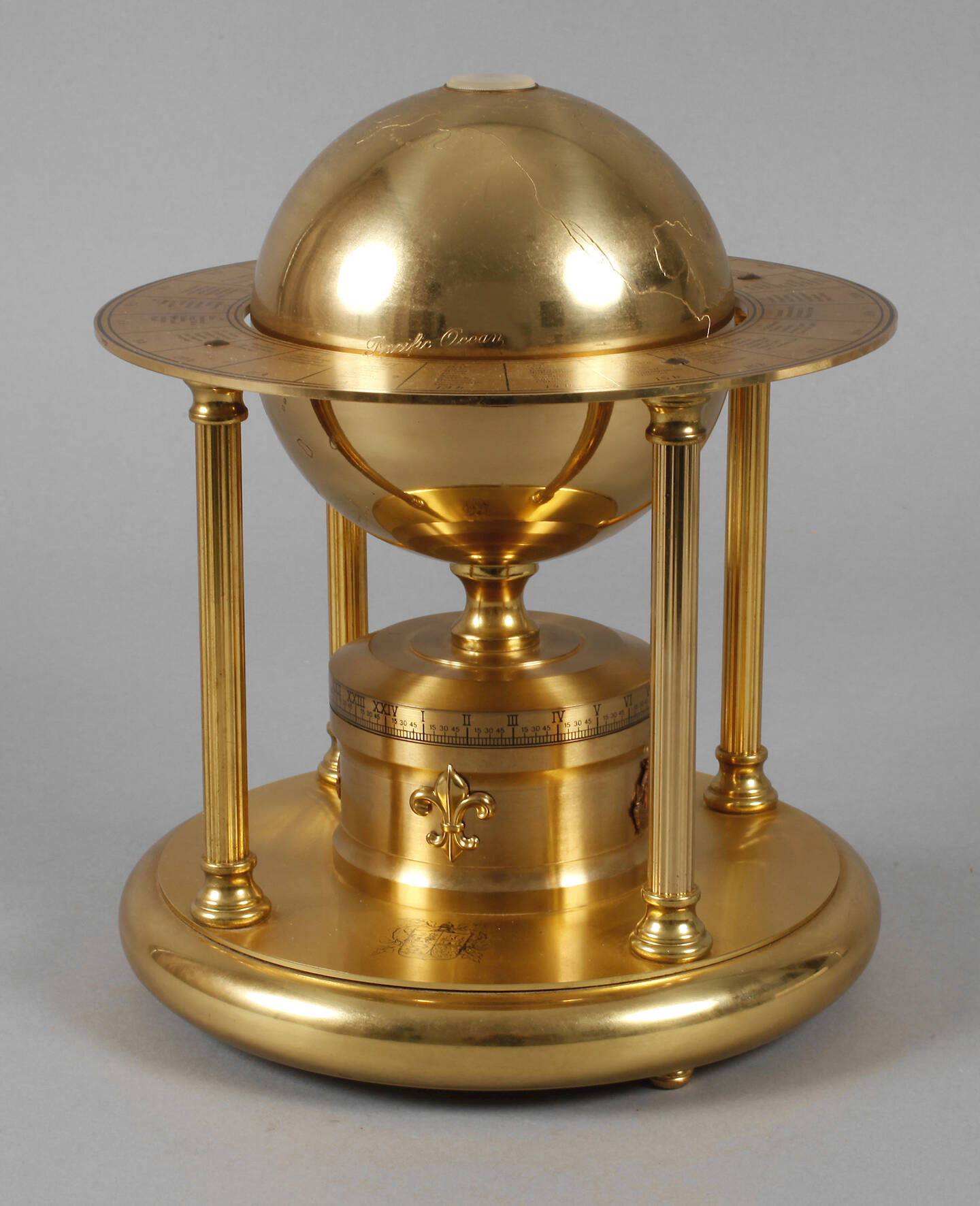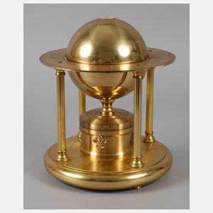 2. Hälfte 20. Jh., limitierte Edition No. 411 von 999, Messing zaponiert, sich drehende Weltkugel mit Kompass, Ring mit Zeitzonen, Quarzwerk, funktionstüchtig, H 28 cm.
