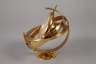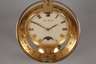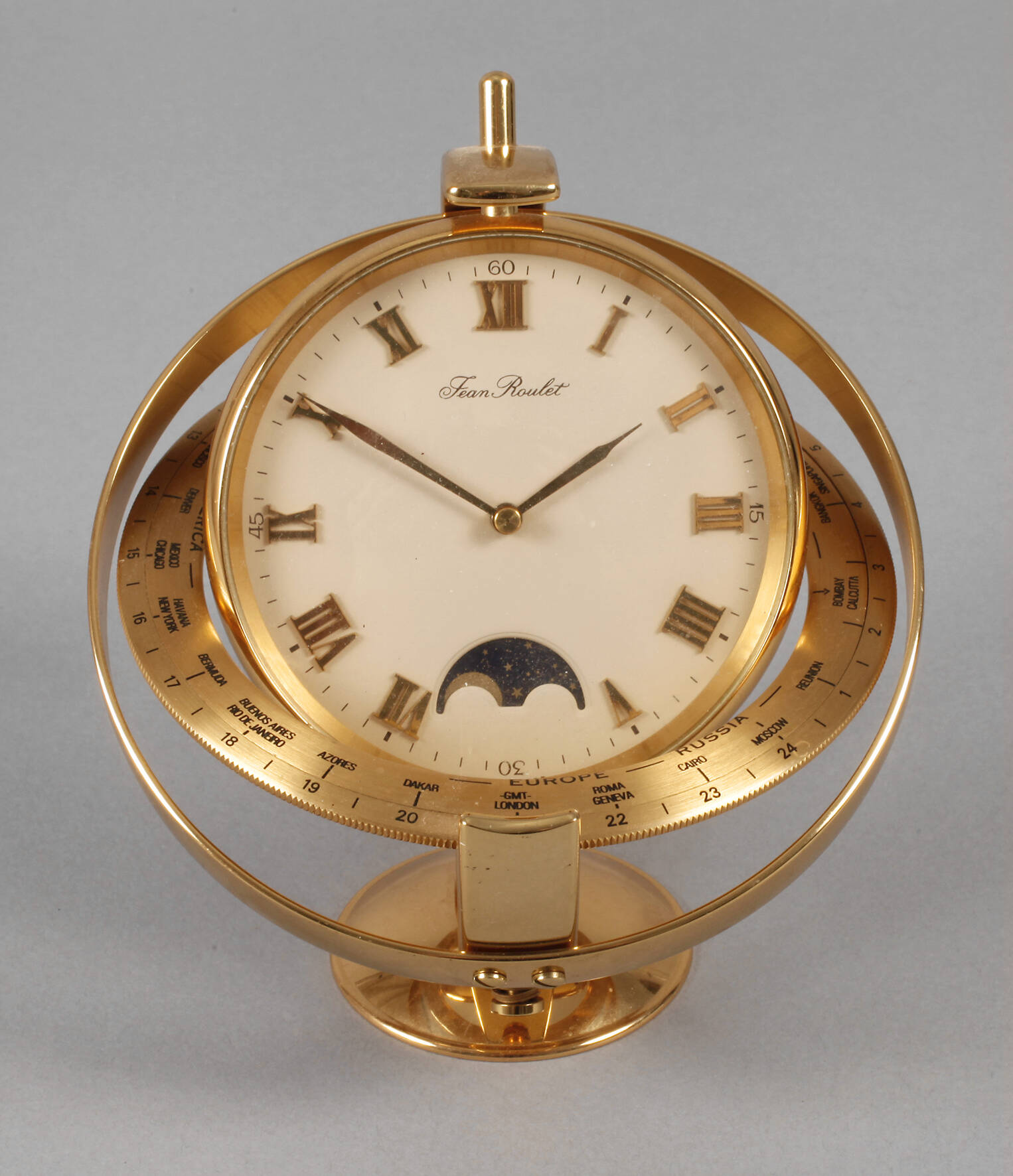 1988, in Form einer Weltzeituhr, aus vergoldetem Messing, Ziffernblatt mit Anzeige der Mondphase, elektromagnetischer Antrieb, funktionstüchtig, im originalen Etui, mit Anleitung und Garantie, Maße 17 x 14 x 14 cm.