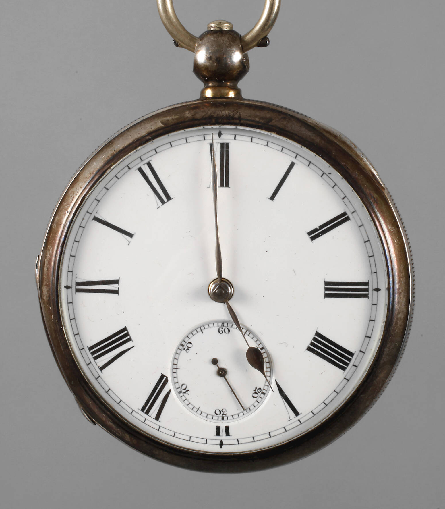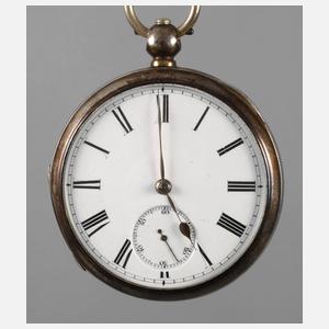 England, 2. Hälfte 19. Jahrhundert, glattes Silbergehäuse mehrfach gepunzt, Werk mit Ankergang, makelloses Emailziffernblatt mit römischen Ziffern und kleiner Sekunde, originale Stahlzeiger, funktionstüchtig, D 54 mm, G gesamt ca. 162 g.