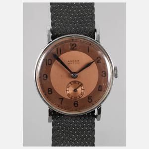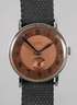 Schweiz, 1960er Jahre, verchromtes Gehäuse, bronzefarbenes Ziffernblatt mit kleiner Sekunde, originale gebläute Stahlzeiger, arabische Ziffern, an schwarzem Stoffarmband, Werk läuft, Deckglas mit minimalem Sprung am Rand, sonst Z 2, D 34 mm.