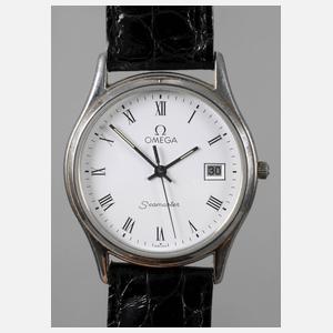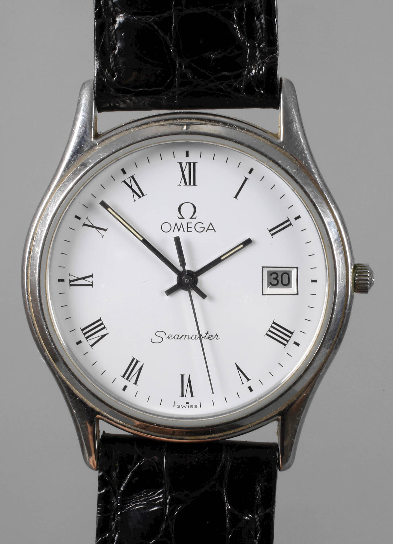 um 1980, Stahlgehäuse, Quarzwerk, weißes Ziffernblatt mit Zentralsekunde und Datum, Funktion nicht geprüft, D 33 mm.