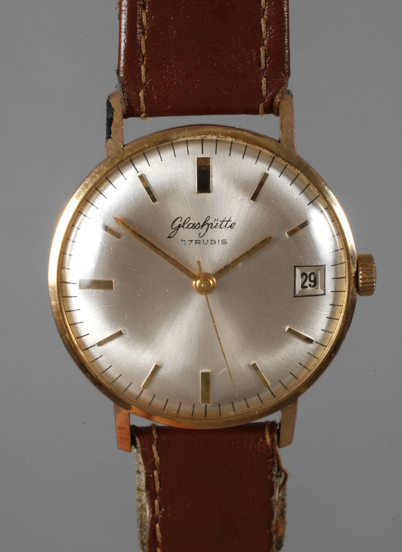 1960er Jahre, Werk mit Handaufzug und 17 Steinen, Zentralsekunde und Datum, schlichtes vergoldetes Gehäuse mit Edelstahlboden, funktionstüchtig, in gutem Zustand, mit originalem Etui und Kaufbeleg aus dem Jahre 1967, Z 1, D 36 mm.